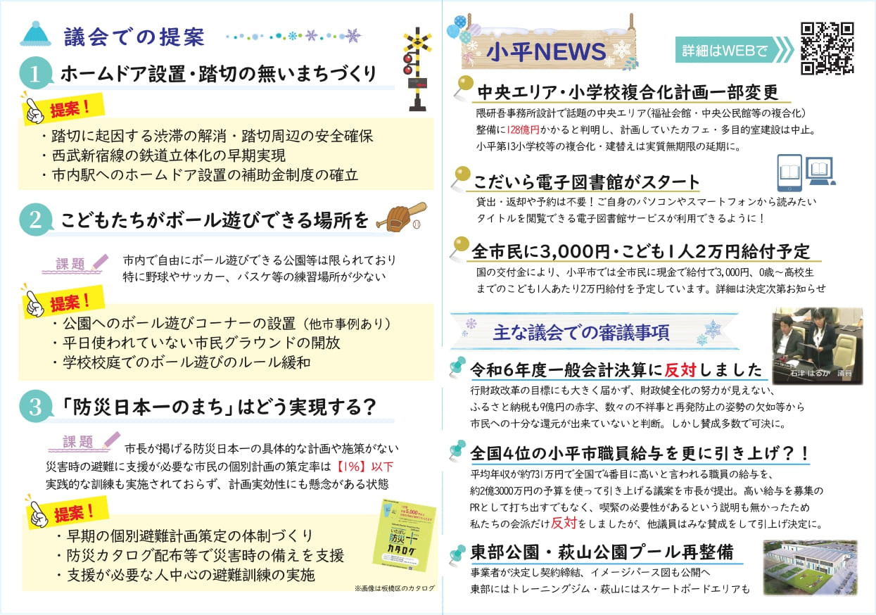 ①議会での一般質問は「鉄道立体化等の踏切対策」「こどもたちの声を形に!ボール遊びできる環境は」「防災の取組」について